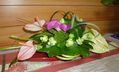 花材は、アンスリューム、カラー、バラ、シキミア、ナデシコ、